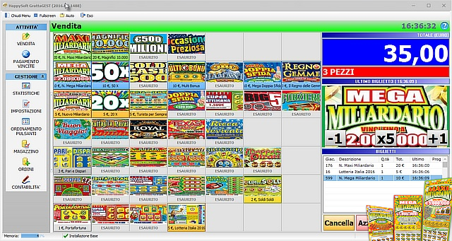 Software realizzato da zero per i Gratta e Vinci, GrattaGest e' perfetto per qualunque tipologia di esercizio: contabilità, gestione dipendenti, ordini, vendite in tempo reale (con fantastiche statistiche sui dati di vendita). vincite, magazzino. Tutto facilissimo e visuale: con un solo click del mouse si carica un intero ordine settimanale! Già pronto per collegamento ad App (disponibile da dicembre), si aggiorna automaticamente ogni mese con i nuovi biglietti che vengono aggiunti.